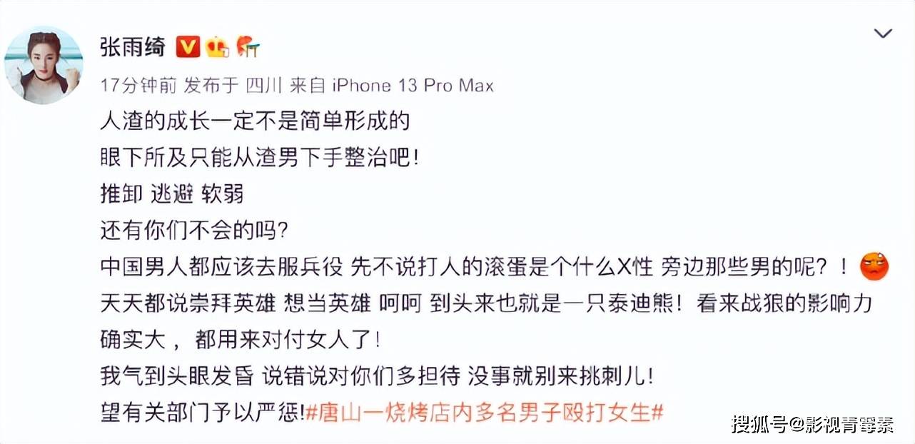 张雨绮说了一段不该说的话:“中国男人都应该去服兵役,先不说打人的滚蛋是个什么X性,旁边那些男的呢?天天都说崇拜英雄,想当英雄,呵呵,到头来也就是一只泰迪熊!看来战狼的影响力确实大,都用来对付女人了。”